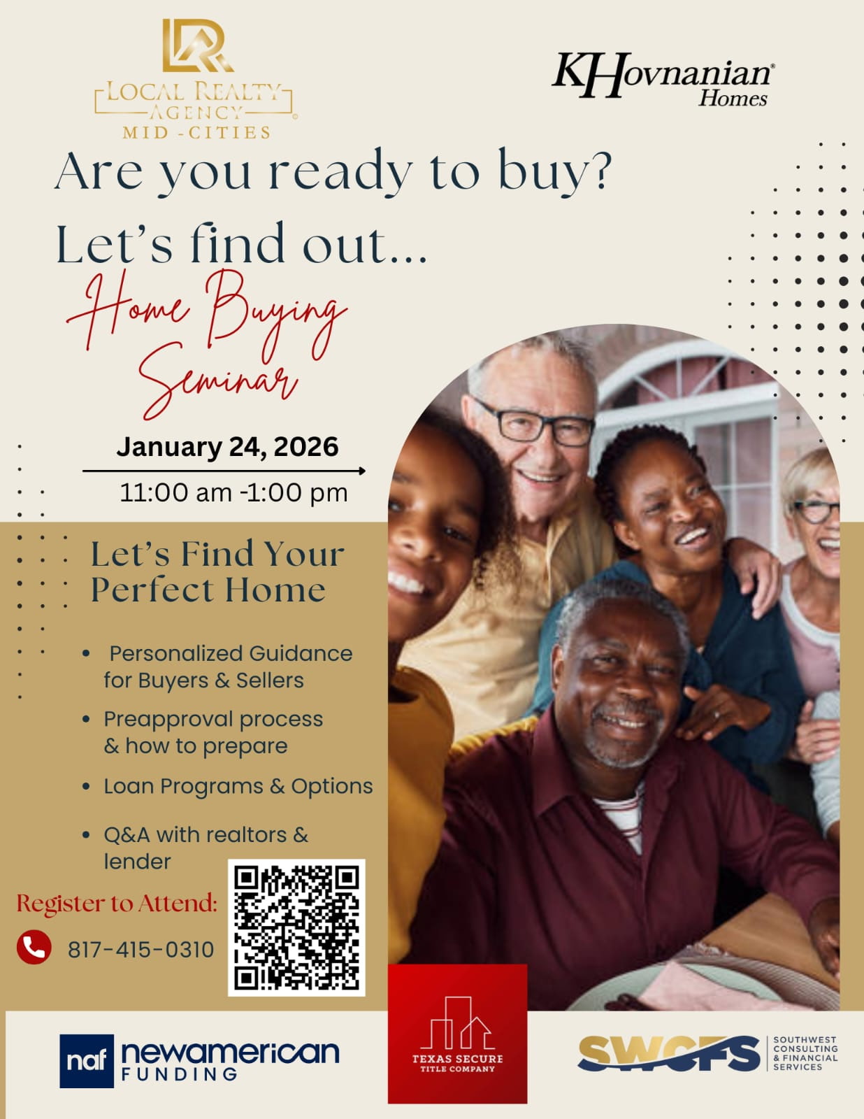 To help buyers get real answers, Local Realty Agency Mid-Cities is hosting a Free Home Buying Seminar on January 24, 2026, from 11:00 AM–1:00 PM.